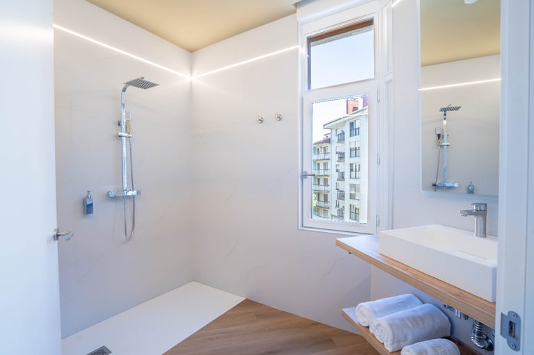 El baño de la habitación ROOM 4 dispone de una ducha de estilo abierto (sin mampara), cumpliendo con la normativa actual. Ideal para quienes prefieren un espacio más accesible y funcional.